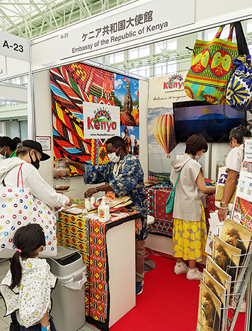 ケニア大使館ブースでは、ケニア産紅茶の試飲やケニアの伝統布カンガ等の紹介を通して、一般市民の方々と直接交流を行い、ケニアの魅力を伝えました。