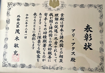 アリ氏は、茂木敏充外務大臣より日本と諸外国との相互理解の促進に貢献したとして表彰されました。