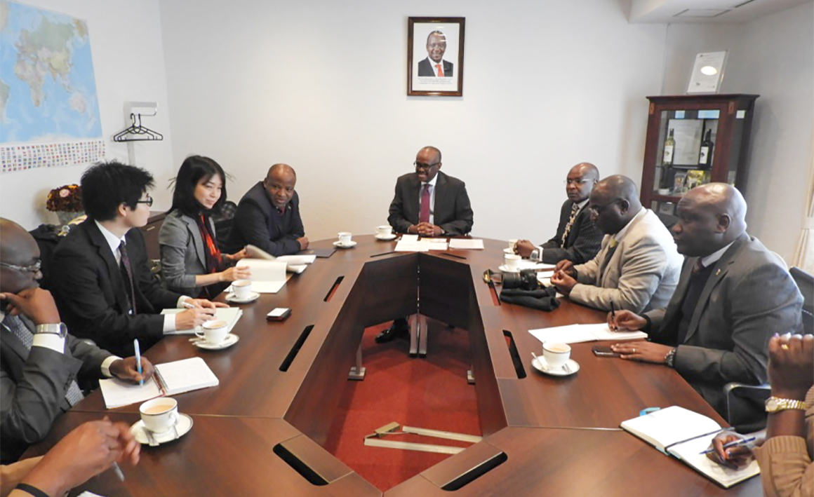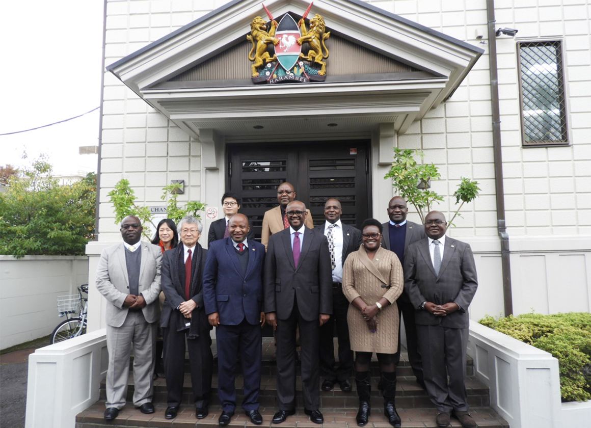 H.E. Ambassador S. K. Maina, MBS poses with Senior Government Officials Delegation led by Amb. D. Wambura (3rd from left), Principal Administrative Secretary, Office of the Deputy President. The Senior Officials are on a visit to Japan on matters pertaining to Big 4 Agenda.
