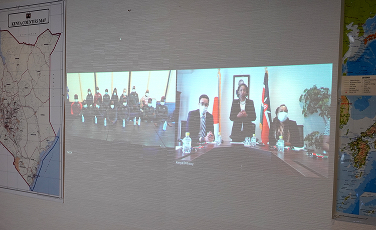 大使館とショアイブ・ヴァヤニ副団長率いる久留米市のケニアチーム第一陣、マルキア・ストライカーズの間で行われたバーチャルミーティング