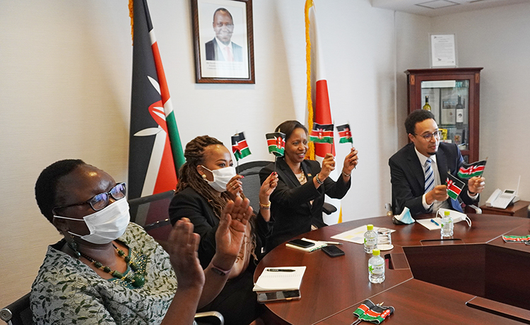 タブ・イリナ大使と駐日ケニア大使館のスタッフが、久留米市に来日した第一陣ケニアチームを歓迎