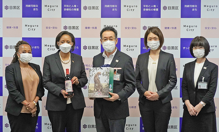 (左から右)カディジャ・イッサ一等参事官、タブ・イリナ大使、青木英二目黒区長、菅井河奈子観光アシスタント、竹内聡子目黒区文化・スポーツ部長
