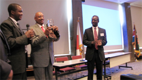 ![]() One of the plenary sessions during the Conference. | ![]() Hon. Danson Mwazo, Kenya's Minister for Tourism exchanging gifts with the Organizers of the Kenya Diaspora Conference – 2012 on 22nd September, 2012. |